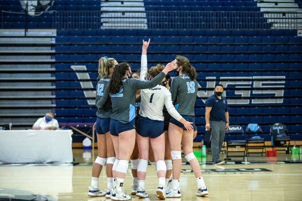 Western Washington University Women's Volleyball huddle together during the home opener in Bellingham Wash. on Friday, April 16, 2021. The Vikings defeated the Wolves, 3-0. // Photo courtesy of Jeff Evans