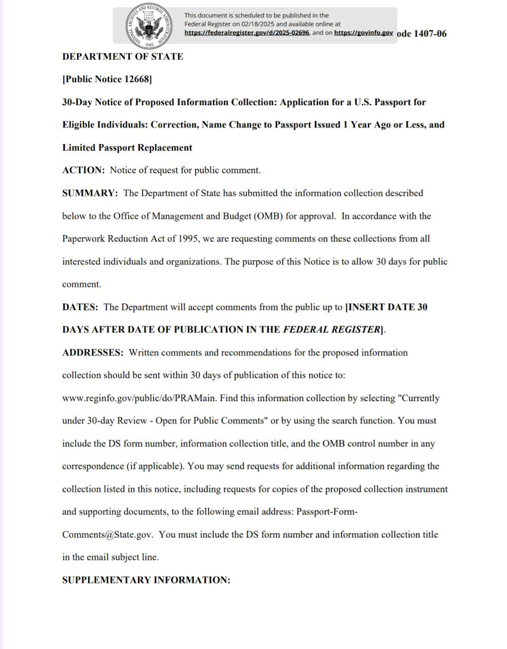 Page one of a notice from the State Department regarding changes to one of its passport application forms. This notice was published on Feb. 18, 2025. // Notice courtesy of the State Department