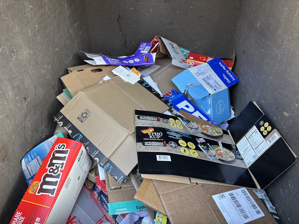A closer look at the cardboard bin at the Ridgeway recycling station on Feb. 13, 2025, in Bellingham, Wash. Several Amazon boxes are in the mix. // Photo by Hope Rasa