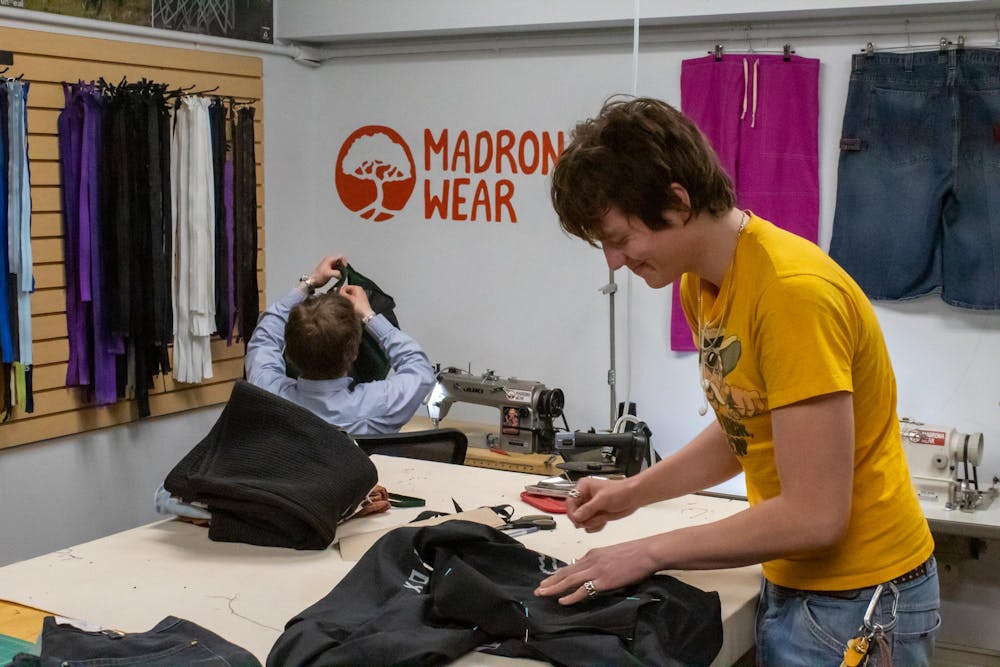 Arrow Chiavario and Kai Arthur work on mending items in Bellingham, Wash., on April 15, 2026. Both Chiavario and Arthur work at Madrona Wear. // Photo by Raleigh Nolan