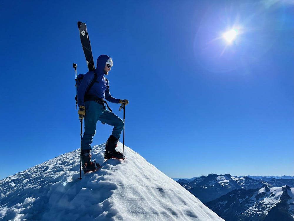 Stu Johnson stands at the top of El Dorado mountain scoping out his ski descent on July 31, 2022. El Dorado is a 6,716 ft mountain in the North Cascades in Washington. // Photo courtesy of Stu Johnson