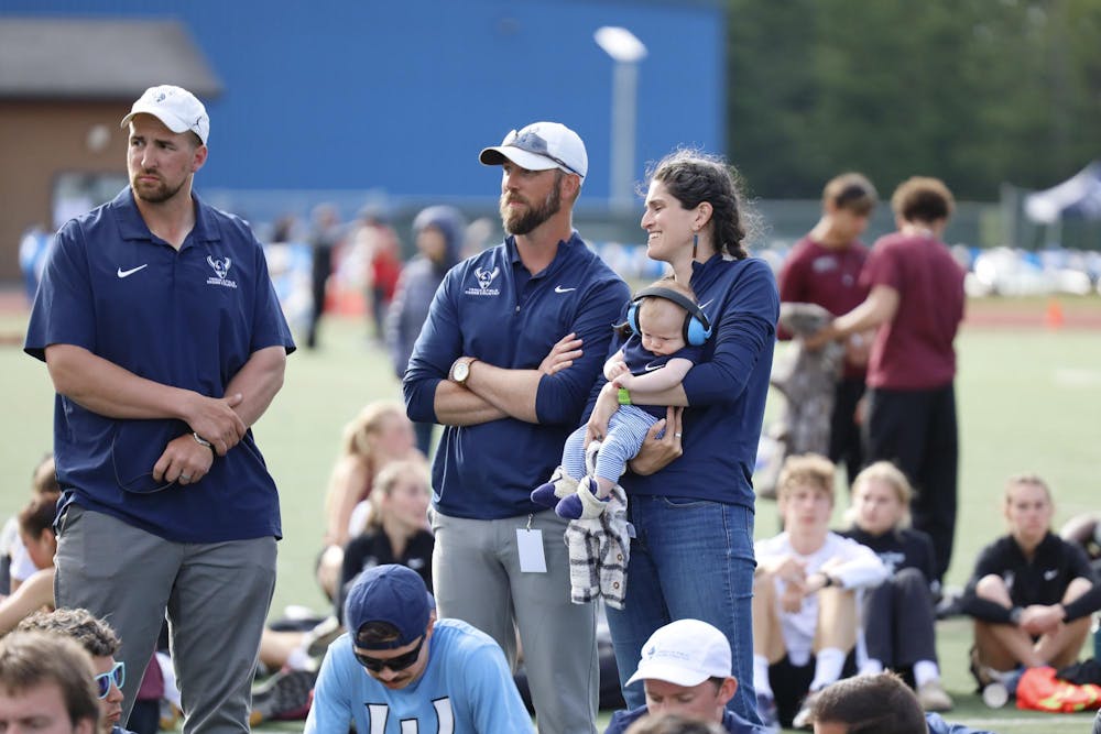 WWU head coach Ben Stensland, distance coach Haley Stensland, and throws and strength coach celebrate their win at the GNAC Outdoor Track & Field Championships at Civic Stadium in Bellingham, Wash., on May 10, 2025. WWU came away with 14 gold medal finishes, 11 silver medal finishes and 14 bronze medal finishes. // Photo by Jeff Evans, courtesy of WWU Athletics