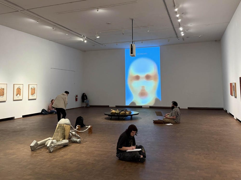 Western Washington University students taking notes on Zervas’ exhibit in the Western Art Gallery on Jan. 15, 2026. They are surrounded by Zervas’ work of paintings, sculptures, and video art. // Photo by Mackenzie Rankin