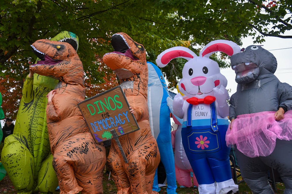 People in inflatable costumes dance among protesters at Maritime Heritage Park in Bellingham, Wash., during the second nationwide “No Kings” protest on Oct. 18, 2025. This protest was one of 2,700 across the country. // Photo by Caitlin Grygorcewicz