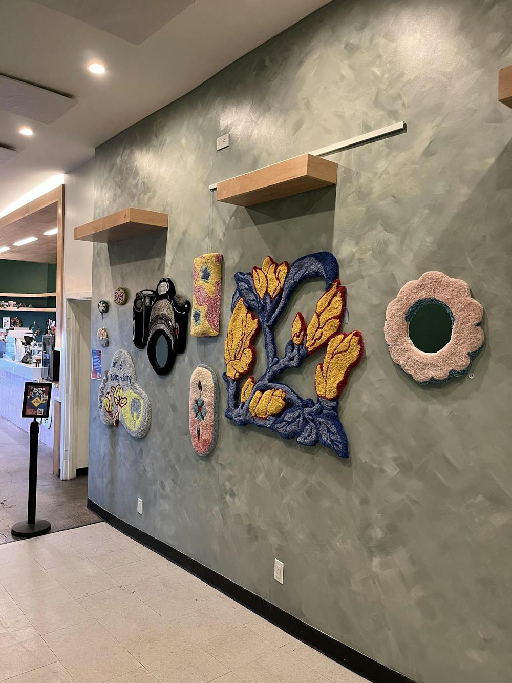 Tufted wool rugs hang on display at Daytrip Cafe on Feb. 17, 2026. The rugs are crafted by No Design, a local wool rug & textile artist, and will be featured at the cafe for the remainder of February. // Photo courtesy of Aaliyah Synn