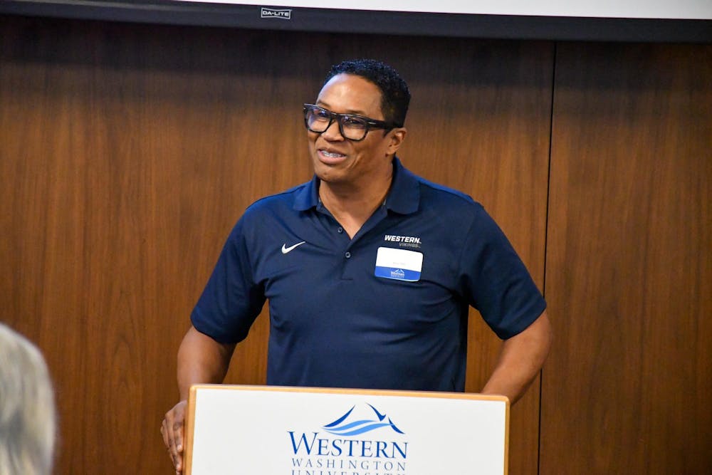 Cim Hansen shares old stories while being inducted into the WWU Hall of Fame on Feb. 28, 2026, in Bellingham, Wash. Hansen was a defining member of the Women’s Basketball team from 1987-91. // Photo by Caitlin Grygorcewicz