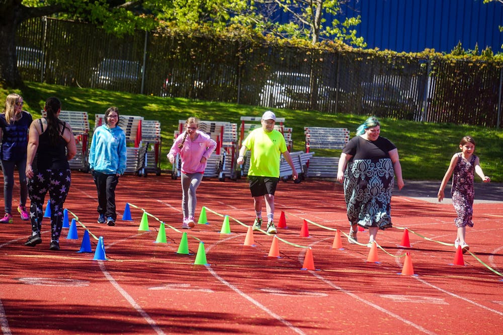A group of Bellingham Independents Special Olympics athletes prepare for a run during practice at Civic Stadium on May 4, 2025. Athletes can participate in track and field, swimming and soccer in the spring season. // Photo by Brady Rufner