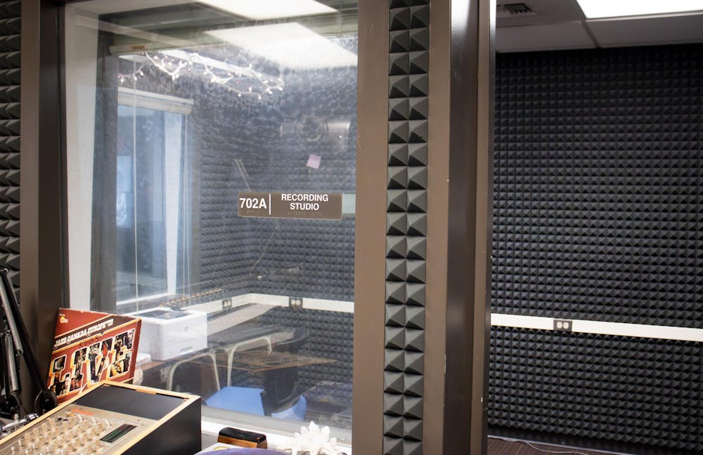 The entrance to the KUGS recording studio, located in the Viking Union in Bellingham, Wash., on Feb. 20, 2026. One side of the wall is where musicians play, and the other is where the sound engineer records them. // Photo by Katherine Rogers