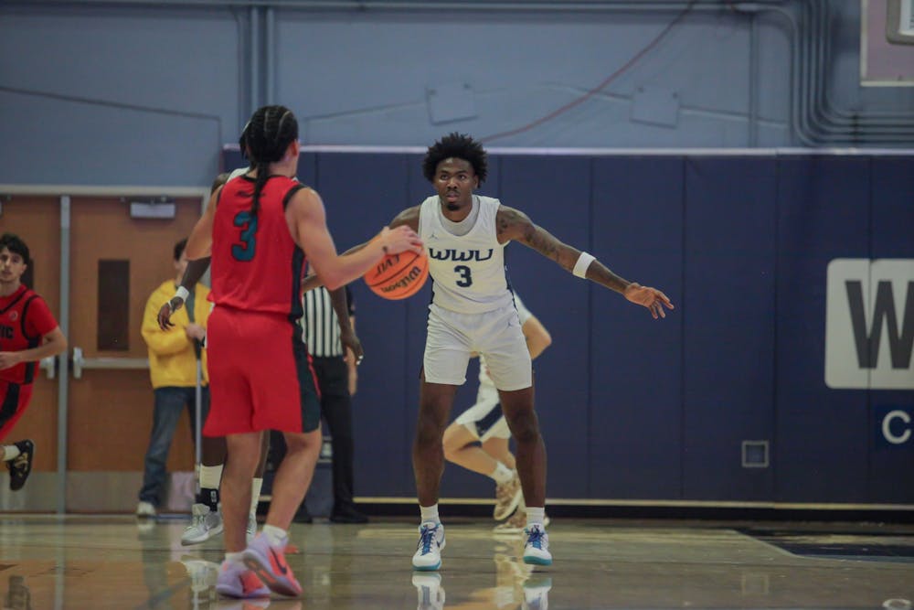 Junior guard Malachi Miller (3) defends against a Northwest Indian College player during Western’s 135-57 win over NWIC on Wednesday, Oct. 22, 2025, in Carver Gym in Bellingham, Wash. Miller recorded 15 points and 10 rebounds during the win on Wednesday. // Photo by Christian Larranaga