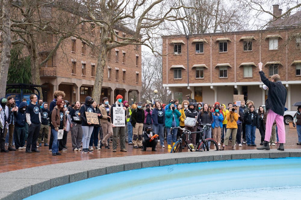 Ian Schaefer Lorenz throws up a fist at the Protect the Pie rally on Friday. Shaefer Lorenz reminded attendees that this country has overcome many discriminatory policy practices that past presidential campaigns had instituted. // Photo by Eli Voorhies