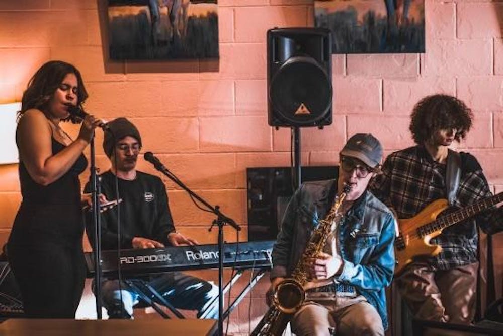 (L to R) Emma Burns, Samuel Harris, Chris Carthum, Alejandro Albright-Reveles performing a show with other members at Greene’s Corner in Bellingham, Wash. on May 25th, 2024. “If people are having fun, the music sounds pretty good too,” Samuel Harris said. // Photo by Kimberly Crass