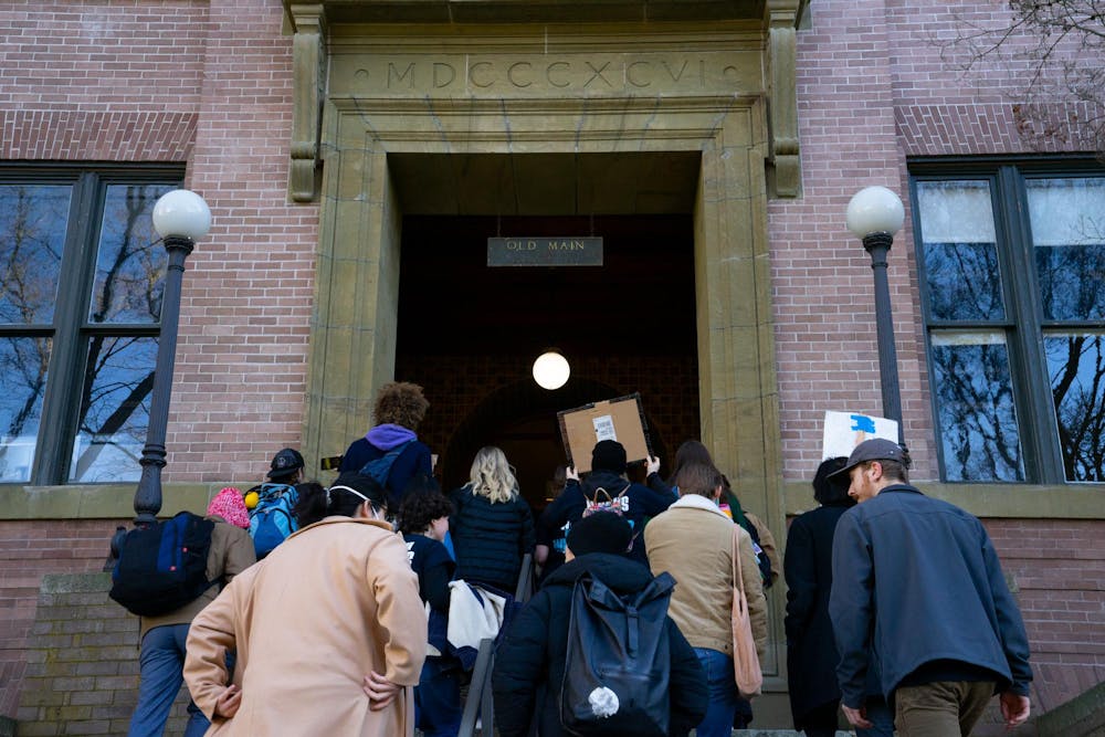 Protestors march up the stairs of Old Main on Friday, Jan. 24, at Western Washington University in Bellingham, Wash. Once inside, they will deliver their letters to the office of President Randhawa. // Photo by Eli Voorhies