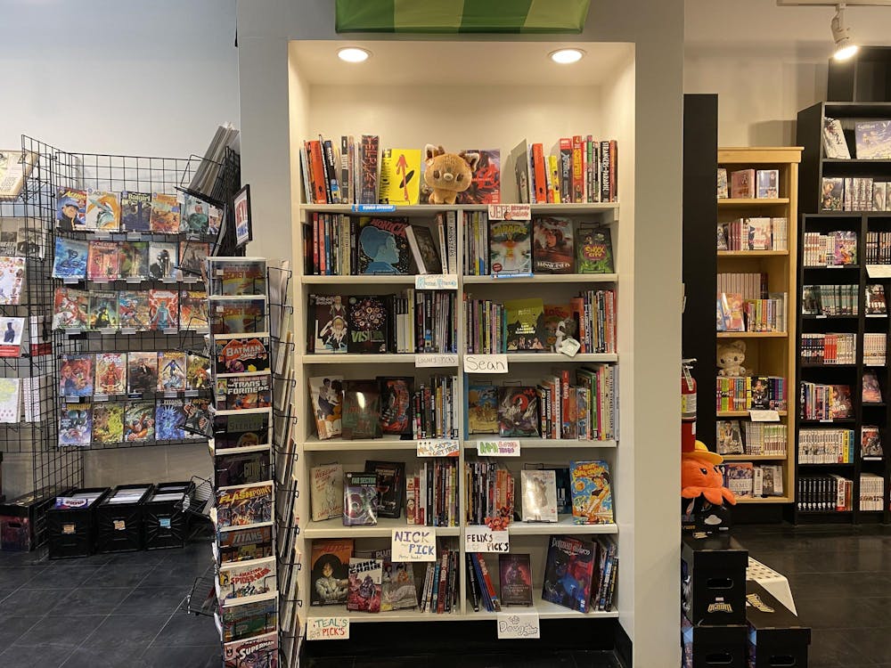 The staff picks shelves inside of Comics Place on Feb. 10, 2025, in Bellingham, Wash. There are racks filled with comics, books and plushies. // Photo by Sophia Raymond