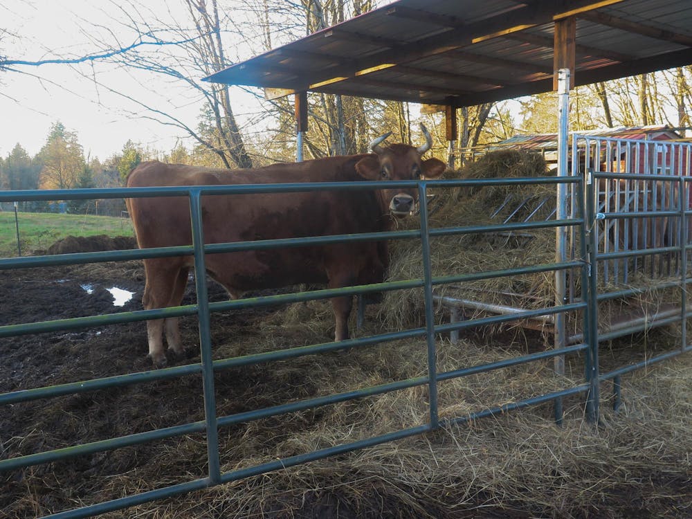 Cedric indulges in some hay dinner at Elf Sanctuary in Ferndale, Wash., on Jan. 23, 2026. Cedric was one of the first animals to arrive at the sanctuary, along with his cow friend Ferguson. // Photo by Noelle Reger