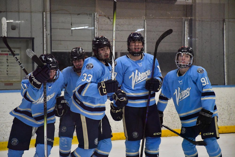 The Vikings celebrate the fourth goal of the game, made by senior Cooper Huntersmith, during a men’s hockey game against Montana Tech on Jan. 23, 2026, at the Sportsplex Arena in Bellingham, Wash. The Vikings closed the first night out with a score of 7-4. // Photo by Caitlin Grygorcewicz