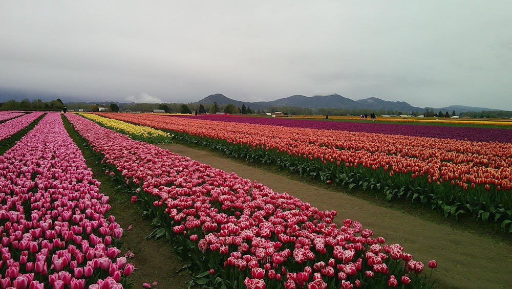 April 27Rows of pink and red tulips stretch as far as the eye can see at the Skagit Valley Tulip Festival in Mount Vernon, Wash. on April 13th, 2026. A gloomy backdrop shows the nature of spring in Washington. //Photo by Ryann Smith