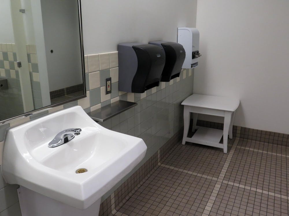 The fifth floor’s restroom in the Viking Union in Bellingham, Wash., on Jan. 29, 2025. It includes a table and free menstrual products and is well-lit and stocked with supplies. // Photo by Allie Van Parys