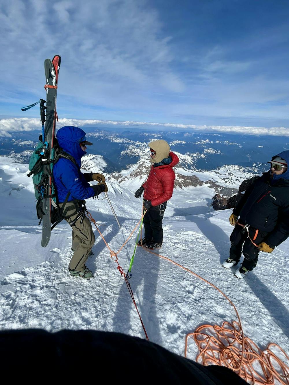 Ben Malouf gets ready to repel down a steep section of snow and ice on May 21, 2025. Right below us was a serac fall, so we had to stop skiing. // Photo by Brady Rufner