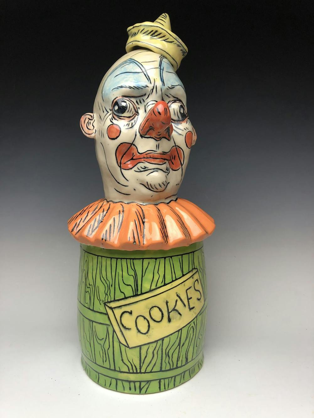 “Clown Cookie Jar” (2024) is Kelly’s puppetry-based influence on full display. Made of white stoneware, the piece is both decorative and functional. // Photo courtesy of Ryan W. Kelly