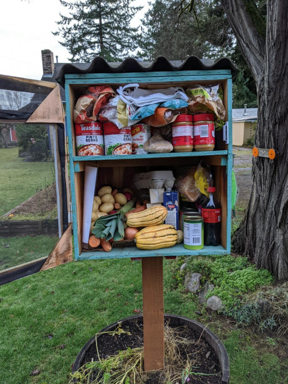 A food share box in the Birchwood neighborhood sits open, recently stocked. Community members are able to come to the 10 food share box sites to pick up free, healthy and fresh food. // Photo courtesy Jean Ryan