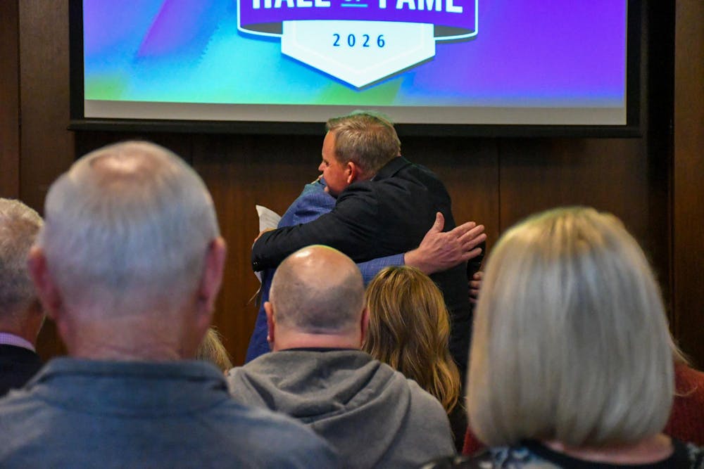 Wyane Gebers and Rob Smith embrace after Smith shared his stories of when Gebers was on WWU’s football team on Feb. 28, 2026, in Bellingham, Wash. This was a part of the Hall of Fame induction ceremony for 2026. // Photo by Caitlin Grygorcewicz