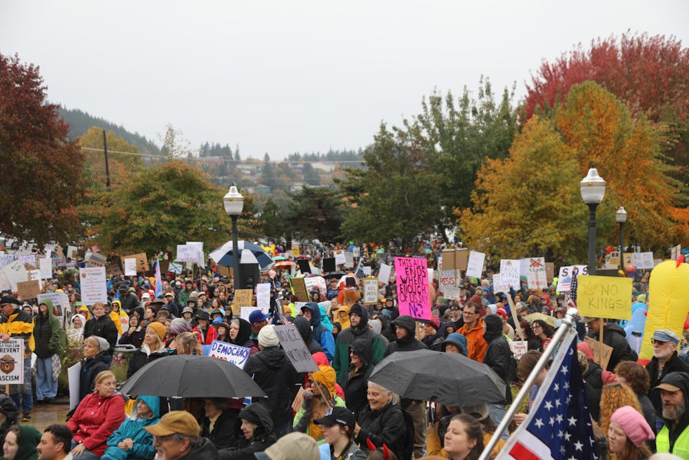 Massive crowds gathered under gray skies and light rain, umbrellas and signs were held high as people protested together amid the damp, autumn-colored trees, their energy high despite the gloomy weather. // Photo by Brodey O’Brien