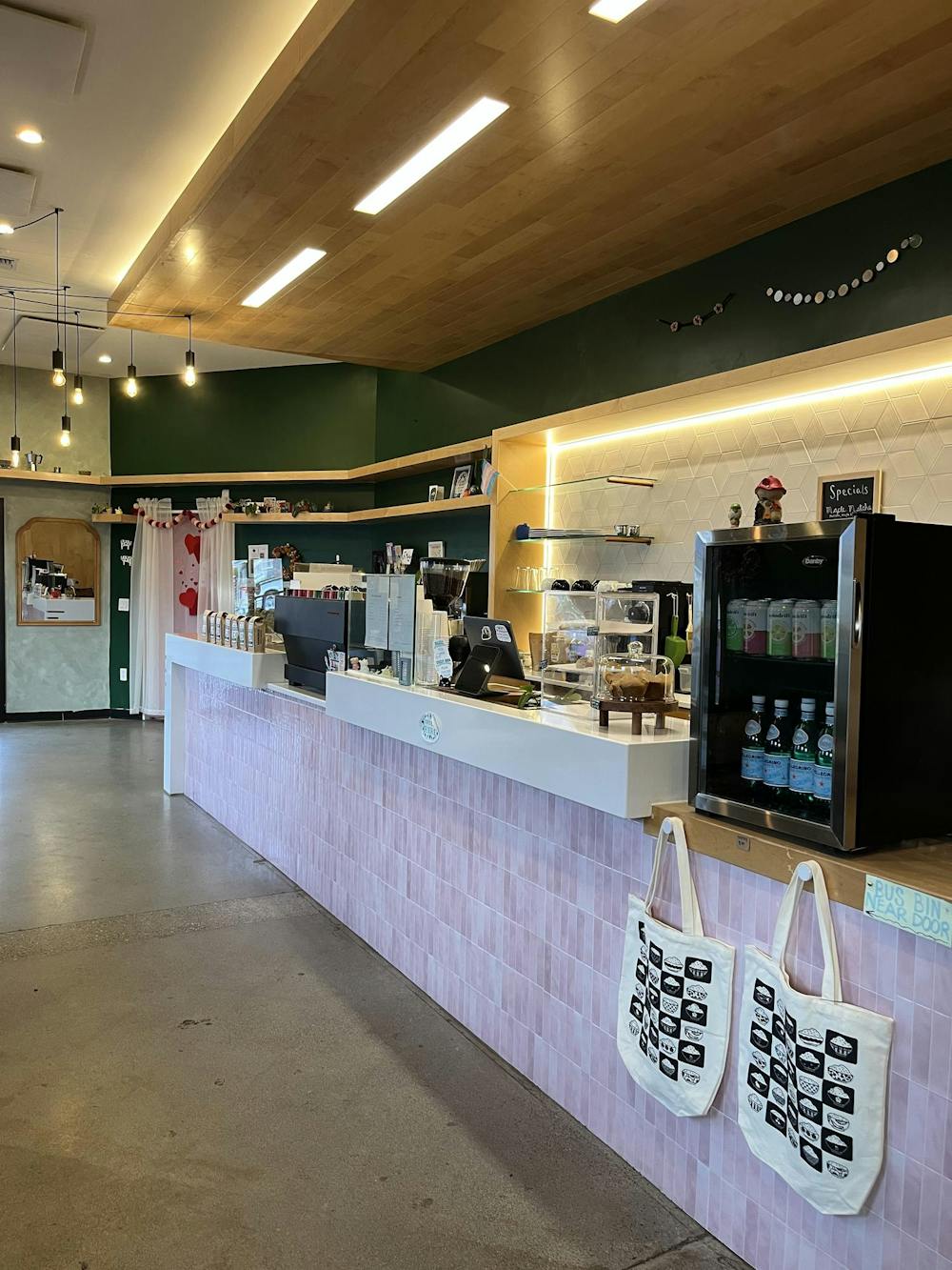 Drinks and pastries line Daytrip Cafe's vibrant, pink-tiled coffee bar on Feb. 17, 2026. The cafe sells house-made chocolate chip cookies, gluten-free coffee cake and croissants sourced from wholesale bakery Lamination Station. // Photo courtesy of Aaliyah Synn
