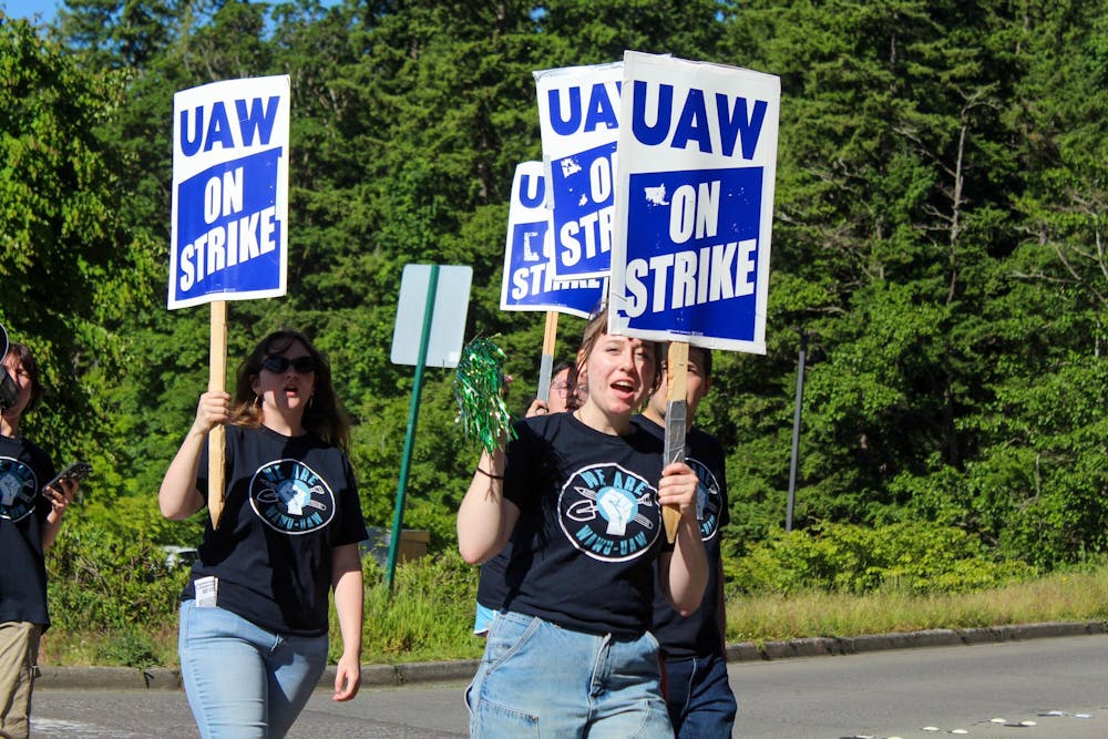 WAWU picketers rally outside the Wade King Student Recreation Center at WWU on May 28. They have been on the picket line since 5 a.m. // Photo by Jae Ranney