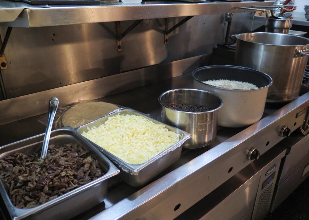 The ingredients for Little Cheerful Cafe’s burritos sit on a countertop just before the soup kitchen opens in Bellingham, Wash., on Feb. 4, 2026. The protein for that week was lamb, purchased from US Foods for less than 25 cents per pound. // Photo by Noelle Reger