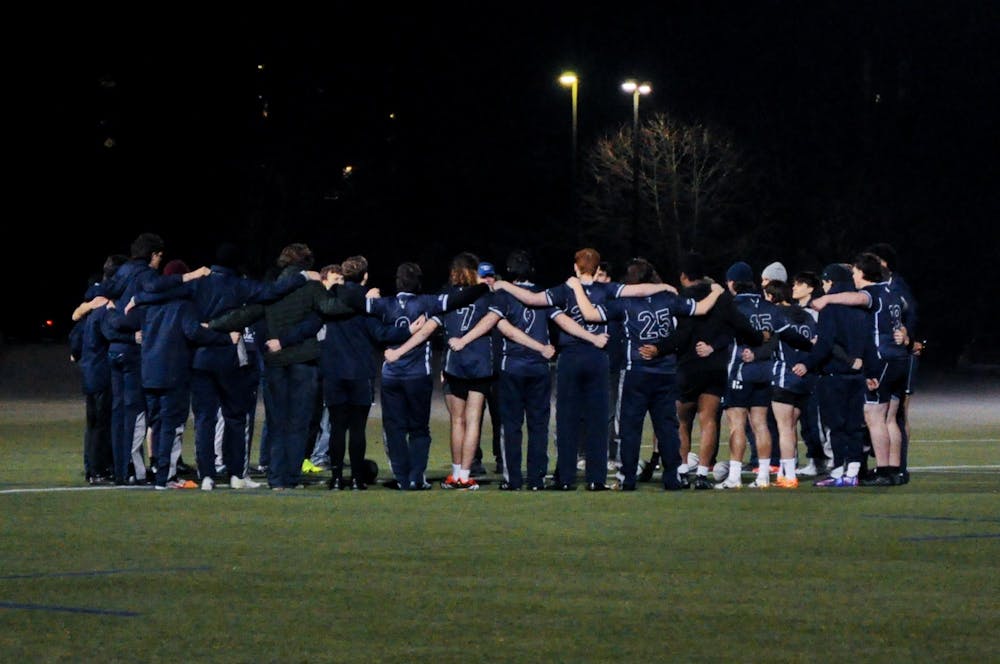 Western men’s rugby team huddles at the beginning of practice on Tuesday, Jan. 28, 2025, at Robert S. Harrington Field in Bellingham, Wash. The team was going over the practice plan. // Photo by Tyler Noonan
