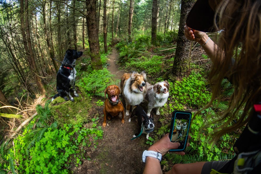 Galbraith Trail Hounds hiker Jenn Radford poses the pack of dogs for a photo to send to their owners on April 29, 2025, at Galbraith Mountain in Bellingham, Wash. The hikers for Trail Hounds make multiple stops every hike to take photos to show the dog’s owners. // Photo by Ben Magnus