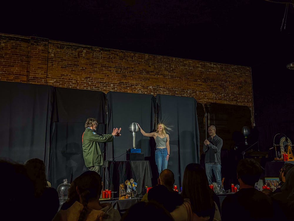 A young couple takes the stage at SPARK Museum in Bellingham, Wash, on Nov. 15, 2025, to discharge a spark with a kiss. The interactive experiment uses a Van De Graaff generator to produce an immense amount of static electricity, which can be discharged by a lightning rod and, in this case, a kiss. // Photo by Madrona Raney