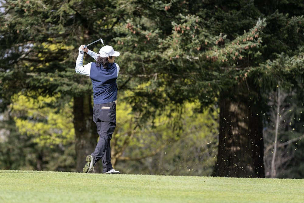 David Sibbett takes a smooth and fast swing to land on the putting green at Bellingham Golf and Country Club on April 10, 2025. Sibbett recently transferred to Western and is ranked #29 in the DII Men’s Golf rankings. // Photo by Chayton Engelson