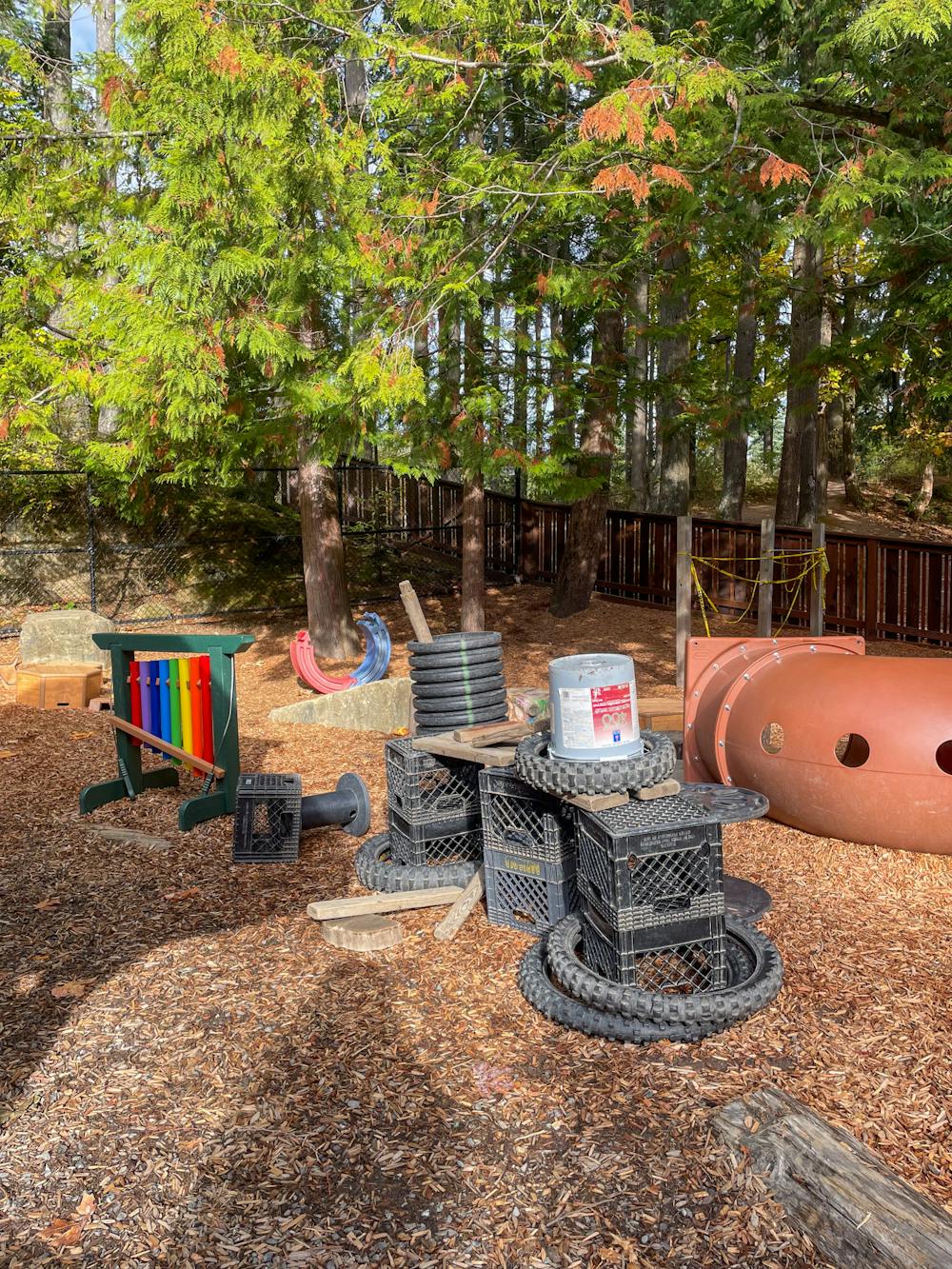 “Loose parts” used for play in the center’s outdoor play area on Oct. 15, 2025. All classrooms, including the infants and young toddlers, spend part of their day outside. // Photo by Ellie Wright