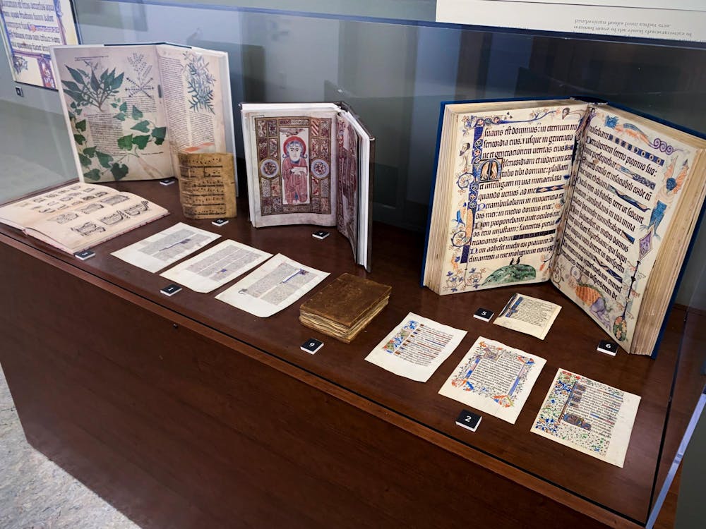 Rare medieval manuscripts sit side by side in their casing at the newly opened “A New Leaf” Archives & Special Collections exhibit in the Wilson Library in Bellingham, Wash. on Jan. 24, 2025. // Photo courtesy of Western Libraries Archives & Special Collections