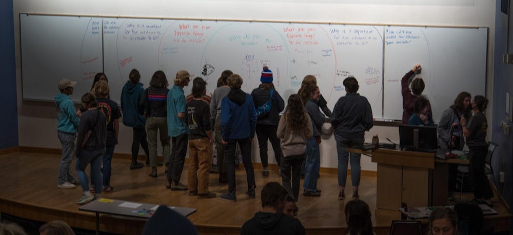 Attendees gather to answer various outdoor-related questions written on a whiteboard in Bellingham, Wash at the 2024 No Man’s Land Film Festival. Eckhardt said she’s excited about seeing more inclusive and accessible ways to be outdoors. // Photo courtesy of Parker Eckhardt