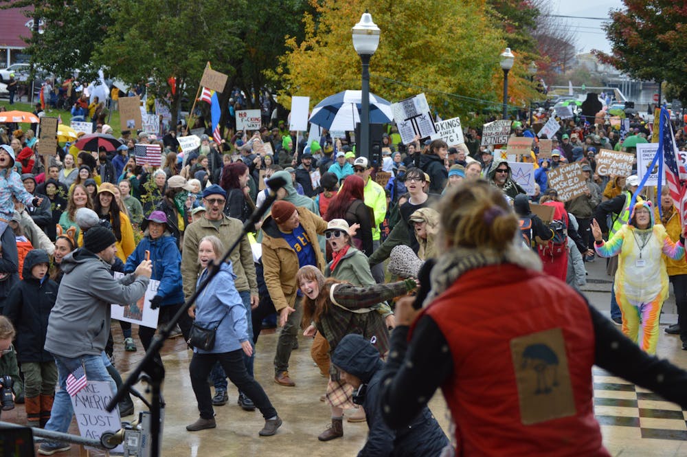 Sadye Osterloh of Dorky Dance Fitness leads protesters in a dance party to end the “No Kings” protest at Maritime Heritage Park in Bellingham, Wash., on Oct. 18, 2025. The second nationwide protest ended with laughter, music and movement despite the rain. // Photo by Janessa Bates