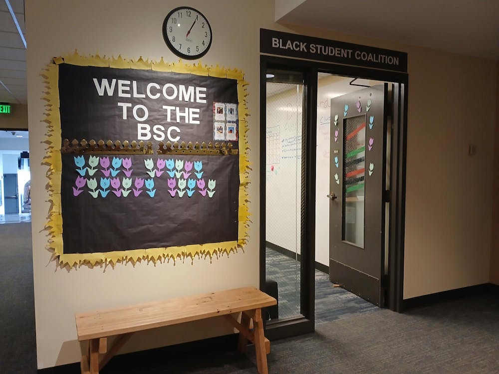 The entrance to the Black Student Coalition in the Viking Union at Western Washington University in Bellingham, Wash. on March 5, 2025 features two-dimensional paper flowers and the red, black and green of the Pan-African flag. The open door attracts visitors on the fifth floor of the Viking Union. // Photo by Josh Hernandez