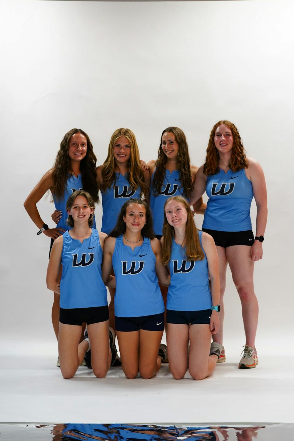 Western cross-country teammates stand together for a photo this fall, 2025. On the top row, from left to right: Sabrina Colbert, Mackenzie Macdonald, Olivia Friedrich and Cate Griggs. On the bottom row, from left to right: Emi Tipton, Cecilia Villagomez Edvalson and Sydney Harri.// Photo courtesy of WWU Athletics