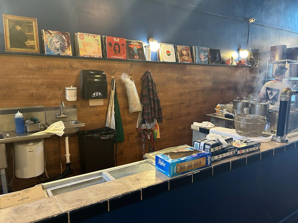 Pel’meni’s kitchen is pictured on Sep. 3, 2024, in Bellingham, Wash. Here, their small staff prepares each order, surrounded by records. // Photo by Morgan Merriam