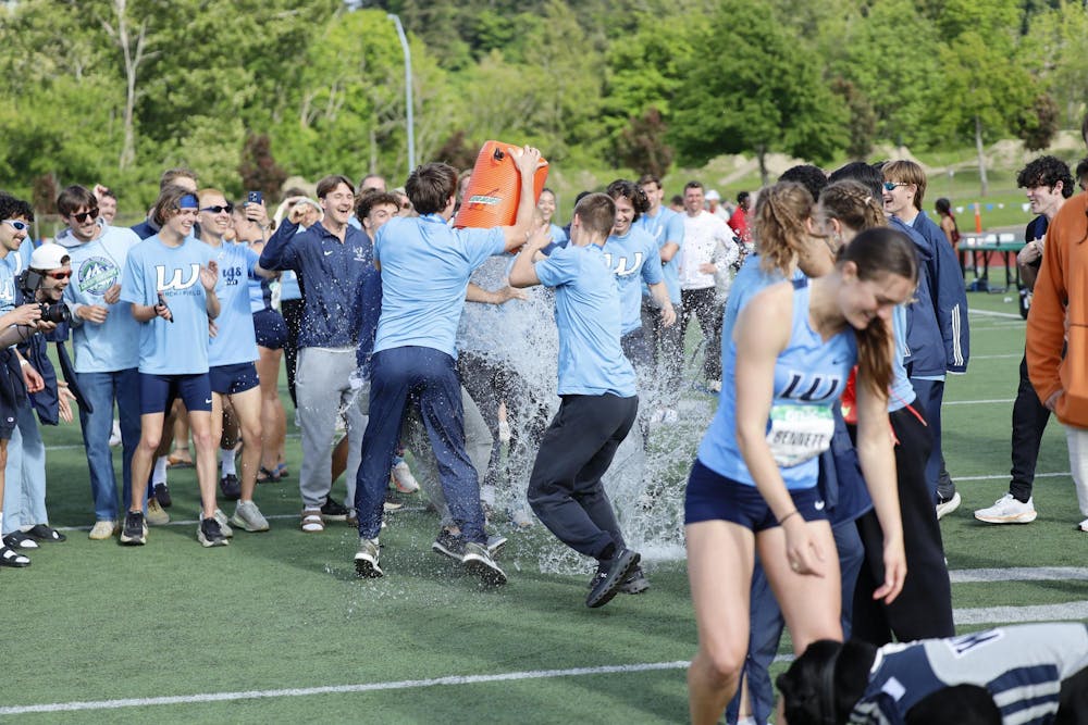 WWU athletes dump water on head coach Ben Stensland at Civic Stadium on May 10, 2025, in Bellingham, Wash. The Vikings swept the GNAC Outdoor Track & Field Championships. // Photo by Jeff Evans, courtesy of WWU Athletics