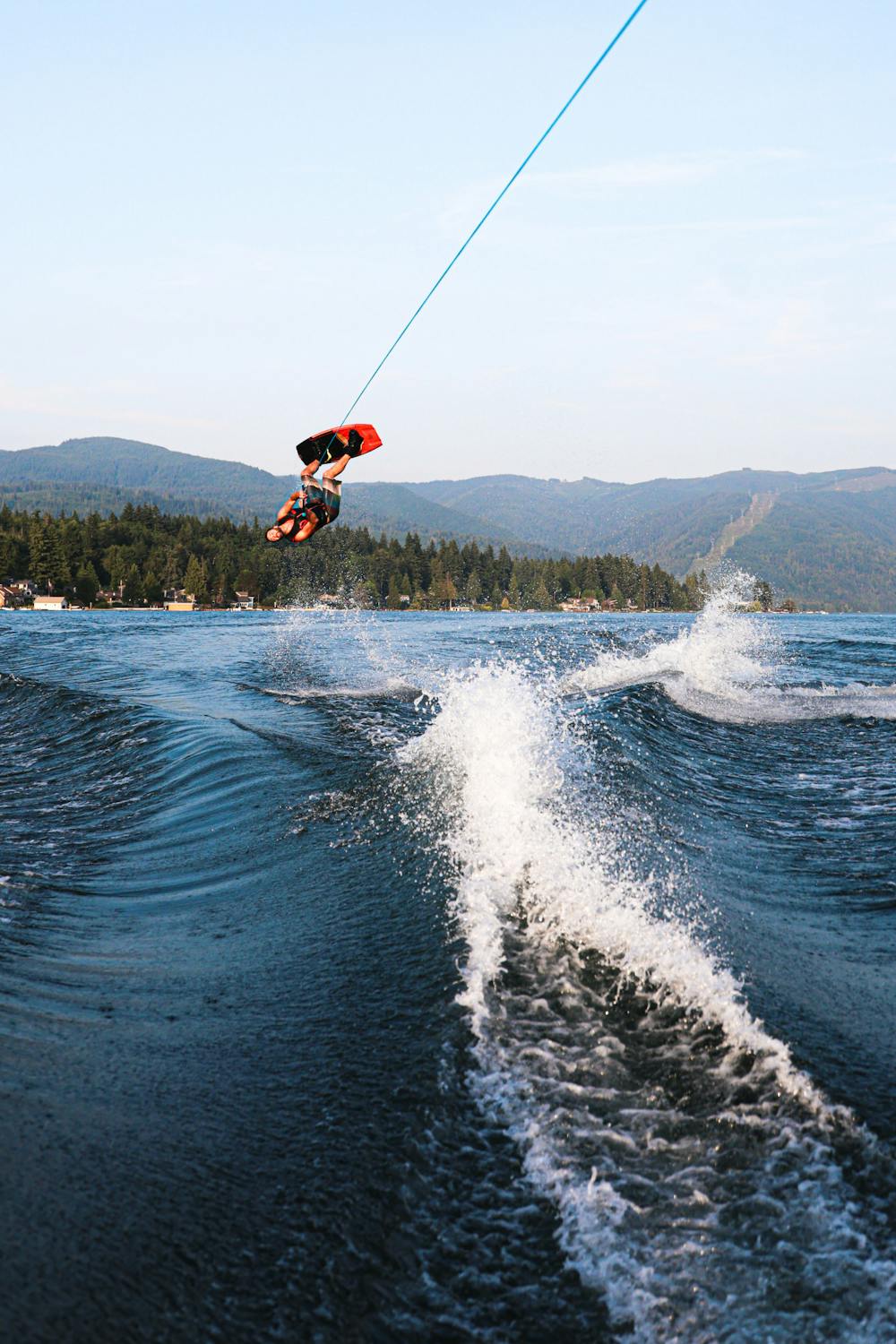 Travis Wade, owner of Whatcom Wake Sports, performing a backroll on a wake board, on Lake Whatcom, June 23, 2025. The moves displayed are some of the tricks that Whatcom Wake Sports has the opportunity to teach in their lessons.// Photo courtesy of Whatcom Wake Sports