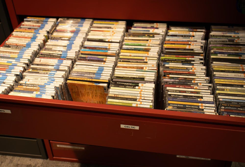 More of KUGS CD collection in a drawer labeled ‘Celtic’ in the Viking Union in Bellingham, Wash., on Feb. 20, 2026. KUGS has CDS from nearly every genre and region. // Photo by Katherine Rogers