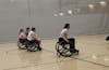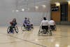 A first-time wheelchair basketball player races down the court during a scrimmage inside Wade King Student Rec Center in Bellingham, Wash., on Feb. 2, 2026. Open to all participants, the club members eagerly share their love of the game with new players. // Photo by Erica Stavnem