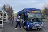 Western Washington University students board the bus at the Wade King Rec Center stop in Bellingham, Wash. on Feb. 3, 2026. The bus display alternates between showing the route number and the words “go hawks,” celebrating the Seattle Seahawks’ spot in Super Bowl LX on Feb. 8. // Photo by Jonah Billings