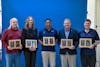 From left, Herm Nelson, Cim Hansen, Marc Hill, Wyane Gabers, and Brad Jackson, holding Mike Palm’s award in Carver Gym at Western Washington University on Feb. 28, 2026, in Bellingham, Wash. Each inductee was honored that day with speeches and their plaques. // Photo by Caitlin Grygorcewicz