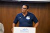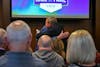Wyane Gebers and Rob Smith embrace after Smith shared his stories of when Gebers was on WWU’s football team on Feb. 28, 2026, in Bellingham, Wash. This was a part of the Hall of Fame induction ceremony for 2026. // Photo by Caitlin Grygorcewicz