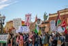 Approaching Maritime Heritage Park, demonstrators chant and hold signs during the March for Gaza in downtown Bellingham, Wash., on Oct. 7, 2025. The march began at the Depot Market Square, where participants returned after speeches at Maritime Heritage Park. // Photo by Janessa Bates