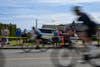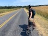 Lila Gill on a bike on Lopez Island, Wash., on July 27, 2024. On the back of the bike, a filled-to-the-brim basket and sandals are strapped on. // Photo by Mars Wetzbarger