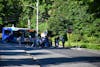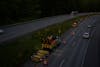 An overhead view from the Samish Way bridge of the Kiewit construction crew preparing to close off the southbound left lane for construction just past Lake Samish exit 246 in Whatcom County, Wash., on May 5, 2025. Kiewit began construction on April 30, 2025, at 8 p.m. to construct a bypass road to be used in the summer to replace old culverts. // Photo by Josh Maritz